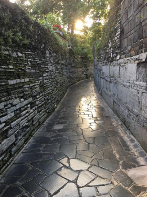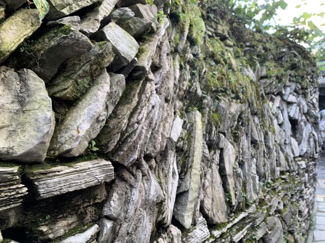 青岩最不缺的就是石头,背街这条小巷就是由青岩当地特有的页岩砌成的。背街的粘合剂十分特殊,它是以条石、块石、团石和不规则石块用糯米浆、桐油、石灰粘合砌筑。而页岩的特色形态,使石巷的细部纹理显得十分丰富,兼具自由与规则的特点,显得静谧悠长。贵州阴雨连绵,而这种特殊的粘合剂使得背街能够在青岩古镇中屹立三百年而不倒,这也是背街“历久”的真实原因。