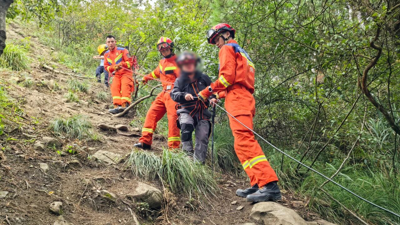消防员通过电话与女子沟通得知,她爬至山顶时体力耗尽,加之云雾山的山势陡峭,已无法自行下山,无奈之下只能拨打119求助。消防员抵达现场后迅速携带好救援所需装备进山寻找被困者,经过一段时间的搜寻成功在山顶小路找到被困女子。