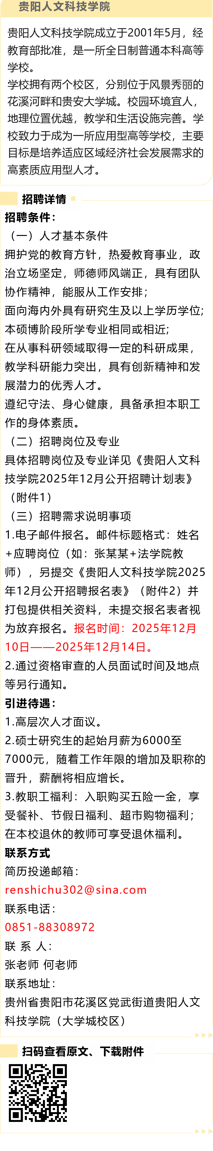 贵阳人文科技学院招聘!起始月薪6000~7000元!五险一金!