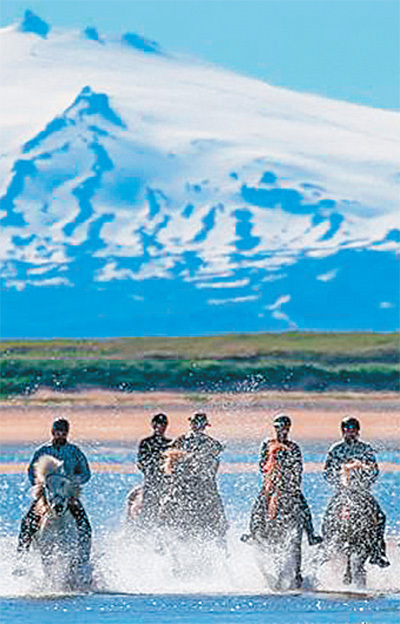 冰岛居民骑马蹚过溪流。(冰岛驻华大使馆供图)