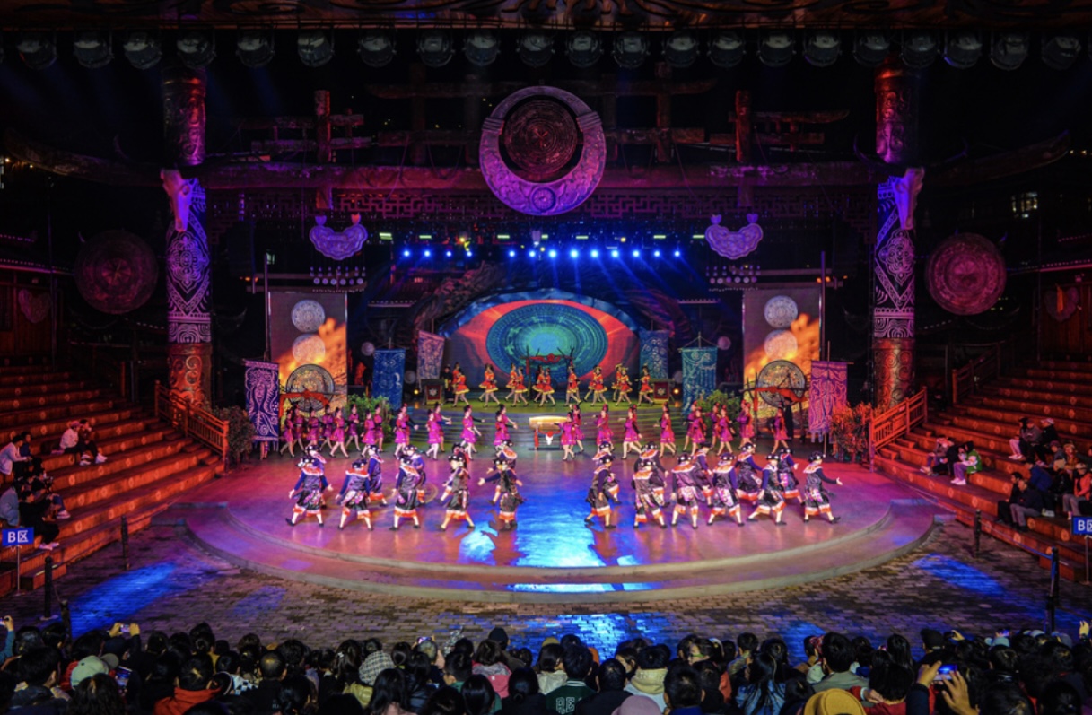 演出结束,夜幕降临,团员们登上观景台俯瞰苗寨夜景。青瓦枫木的苗家吊脚楼上,一盏盏灯火相继点亮。或暖黄、或清亮的灯光从苗寨里透出来,沿着30至70度的山坡铺洒开,从远处眺望,灯火阑珊、流光溢彩,山、楼、桥、水交相辉映。尤其对面山头的羊排苗寨和东引苗寨,在夜景灯光的映衬下,显现出苗族牛角或蝴蝶的文化形象。因而“登观景台看一次夜景”成为每一个游客到西江千户苗寨的必游项目。