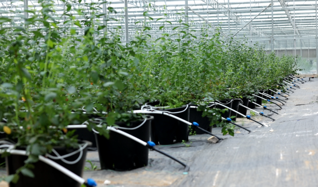 张小飞说:“大棚种植的蓝莓产值比地栽蓝莓提高了四倍左右,大棚种植的水肥营养充足,果实大小均匀,鲜果率较高,糖度也比地栽蓝莓提高两到三个点。”蓝莓三年结果、五年盛产,以前村民们栽种蓝莓都是露天栽培模式,管理粗放、果子品质差,市场竞争力弱,为了摆脱传统农业“靠天吃饭”的先天劣势,现在温室大棚内不仅实现了水肥一体化管理,既节水节肥又降本增效,使得蓝莓成熟期提前,市场占有率大幅提升。