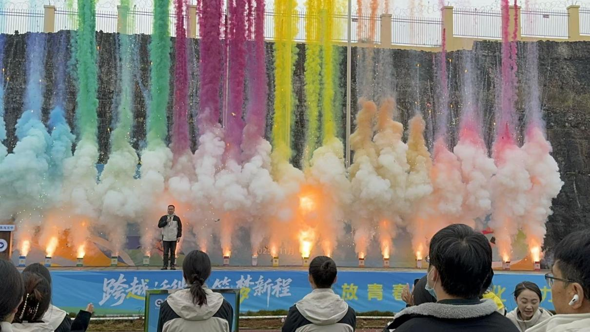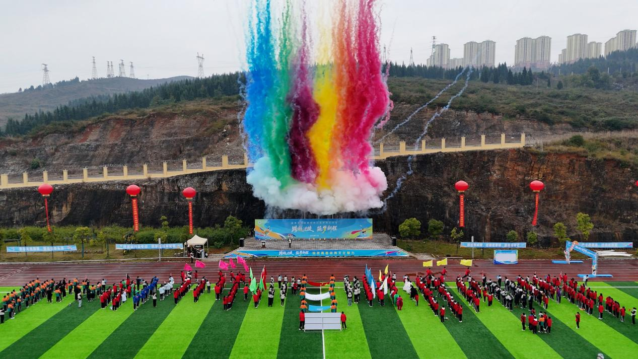 副校长(主持工作)陆锦迈着坚定的步伐走上主席台,随着“我宣布,盘州市聚道高中第三届体育艺术节开幕!”的话音落下,七彩烟浪奔涌,瞬间点燃全场热血,掌声、欢呼声、呐喊声交织在一起,将现场气氛推向高潮。