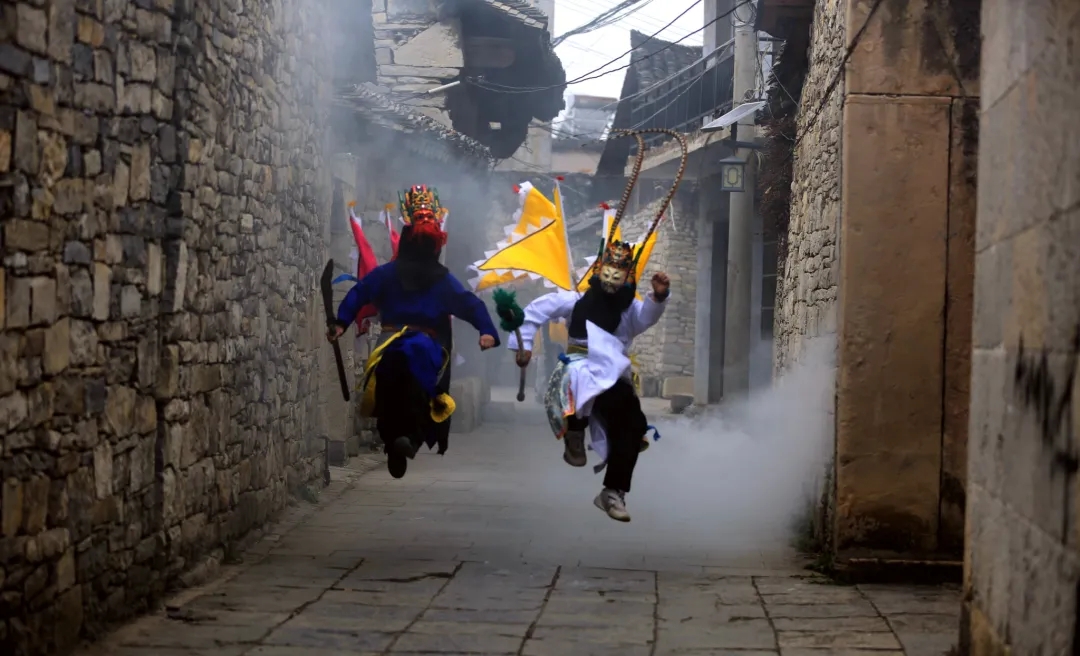 表演者头戴木雕面具
