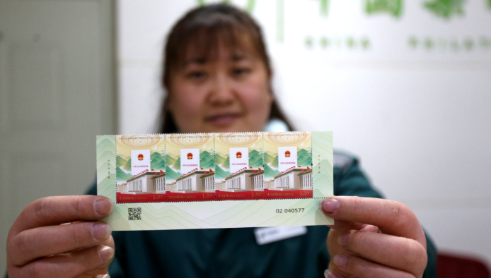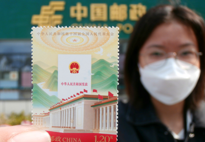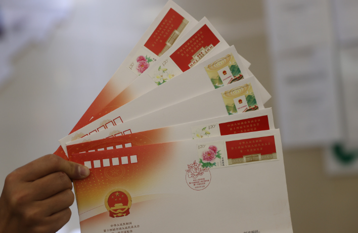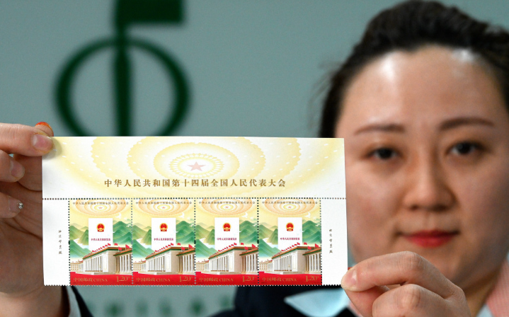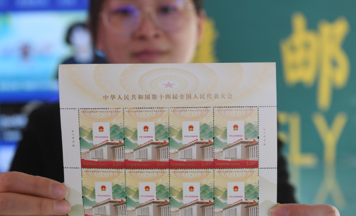 2023年3月5日,中国邮政发行《中华人民共和国第十四届全国人民代表大会》纪念邮票,一套1枚,邮票图案名称为“中华人民共和国第十四届全国人民代表大会”。郝群英摄(视觉中国)