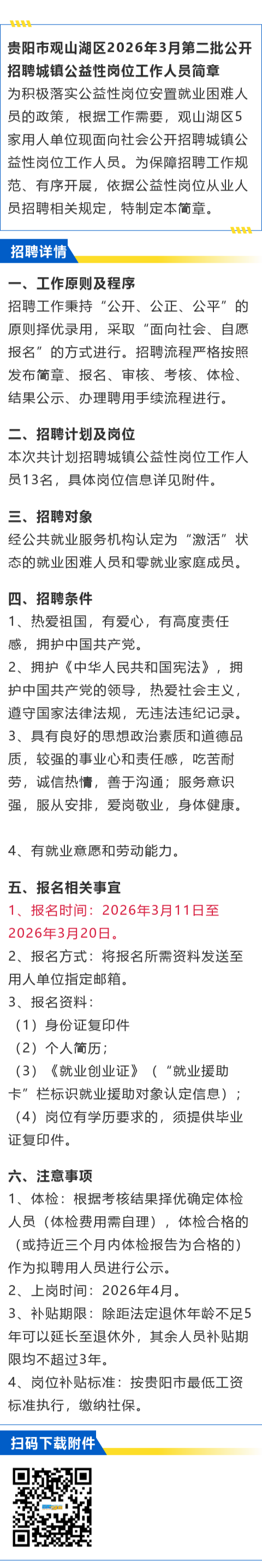 贵阳市观山湖区2026年3月第二批公开招聘城镇公益性岗位工作人员!报名截止时间:3月20日!