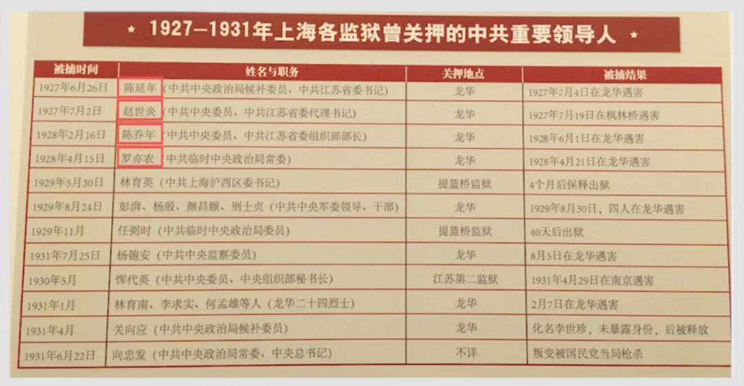 这张图片记录了中国共产党第一次逆境当中的奋斗。这是1927年到1931年上海各大监狱曾经关押过的一些早期党的领导人。1927年,四 · 一二反革命政变爆发后,上海血雨腥风。当时,中共中央的一些机关都在上海,许多党的重要领导人都在上海被捕,甚至牺牲了。