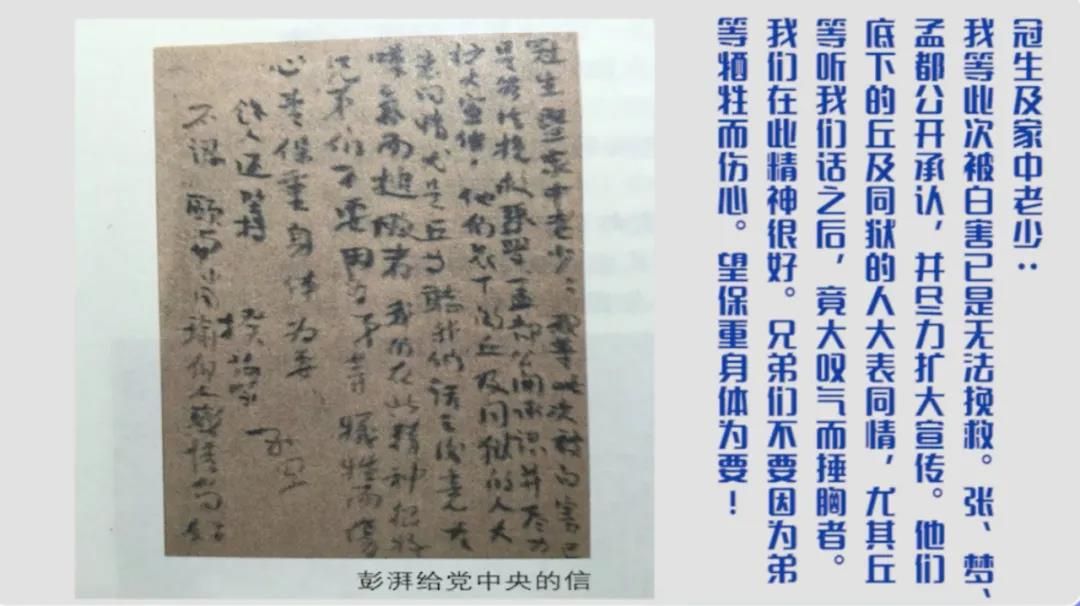 在这情况下,他们还通过监狱内部的一些系统,向中央传出两封信。这两封信现在还被完完整整地保存在北京的中央档案馆,即使是长征那么艰苦的环境,这些信都一封一封在那里,没有丢失。这是彭湃烈士最后的一封信: