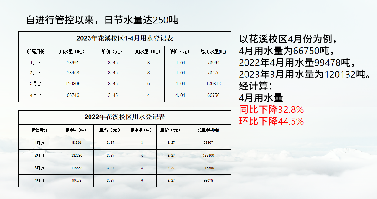 目前,学校已开始按建议方案逐步落实了更换淘汰器具、完善二级计量仪表安装、管网测漏修缮等节水措施。同时加大了校园内节水知识的宣传,通过播放节水宣传视频、张贴《公民节约用水规范》海报、积极发动学生参与节水知识大赛、开展节水专题讲座等形式,提高全校师生的节水意识。通过一系列有效措施,学校用水量已由3月份的12万吨下降到4月份的6.7万吨。在巨大成效面前,学校对进一步系统规范科学的建设节水型高校更具信心和底气。