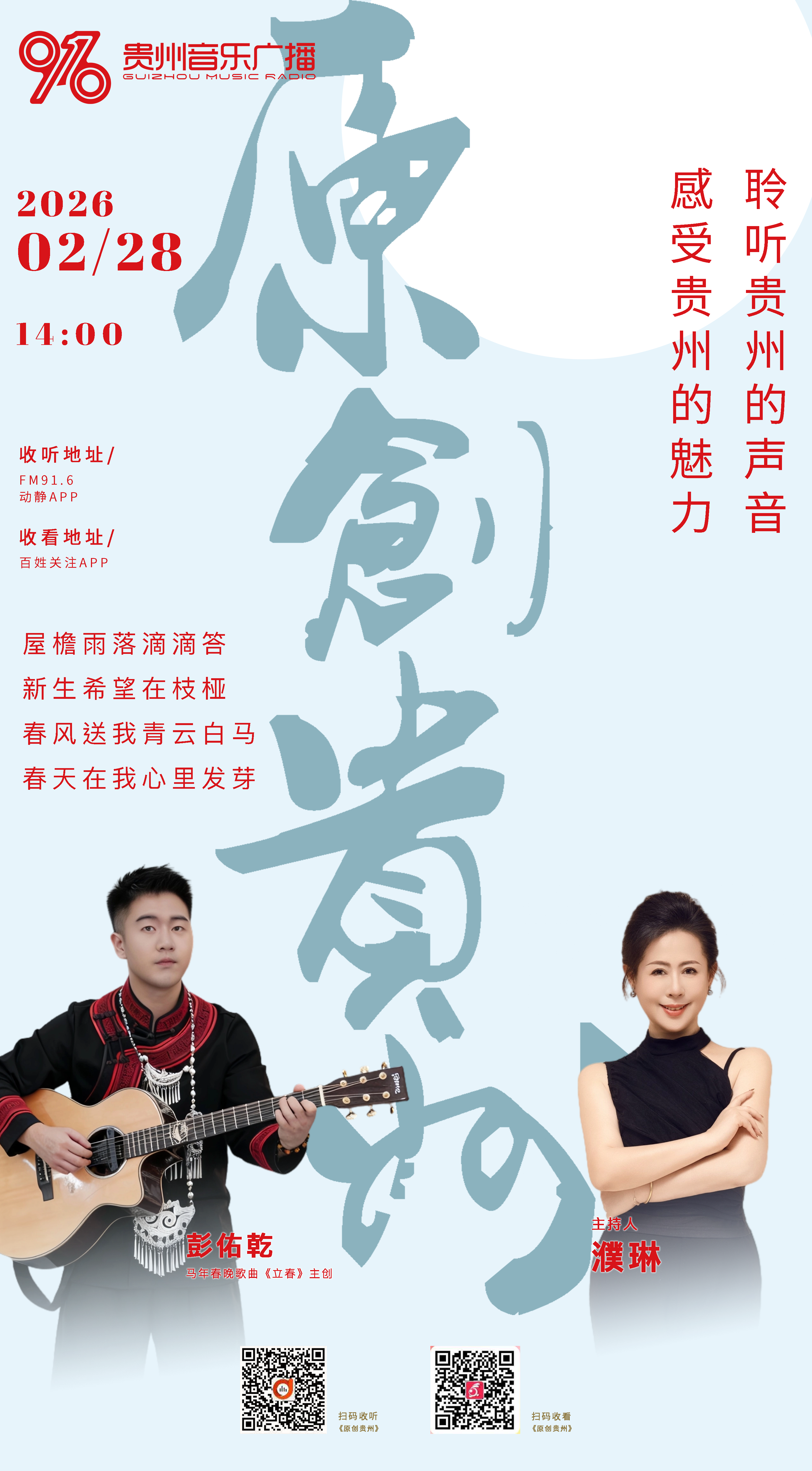 FM91.6贵州音乐广播 2月28日14:00《原创贵州·对话》春晚歌曲《立春》主创彭佑乾,屋檐雨落滴滴答 新生希望在枝桠