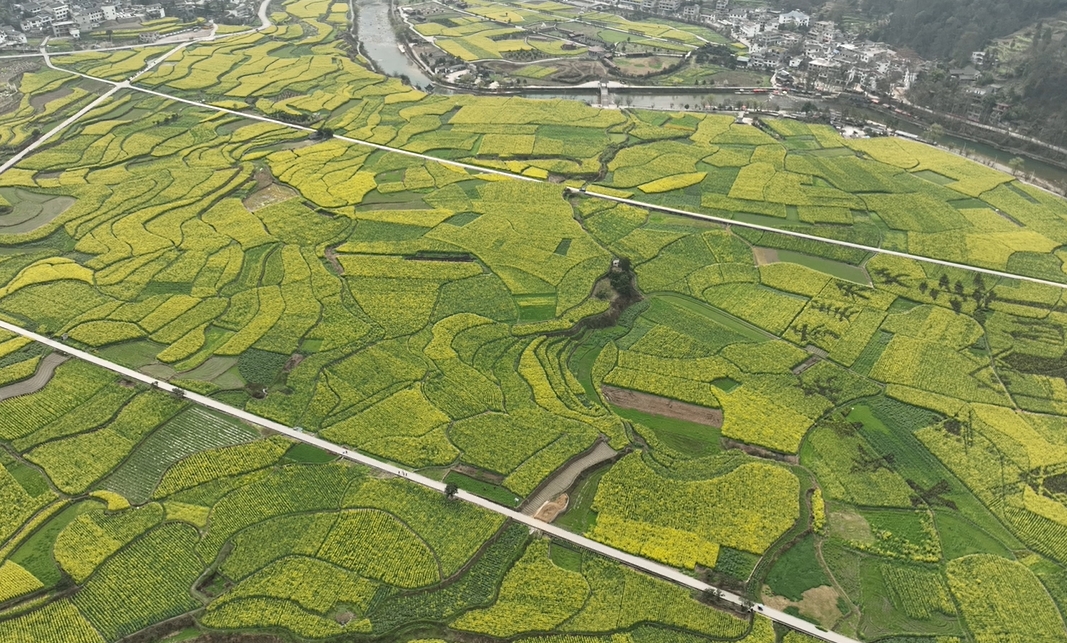 春日的开阳像是被上帝打翻的调色盘,千亩油菜花盛开,宛如一片金色的海洋。这片“金色花海”与周围的绿色山野相互映衬,构成了一幅绝美的画卷。而青龙河如碧玉绸带缠绕其间,将油菜花田怀中。