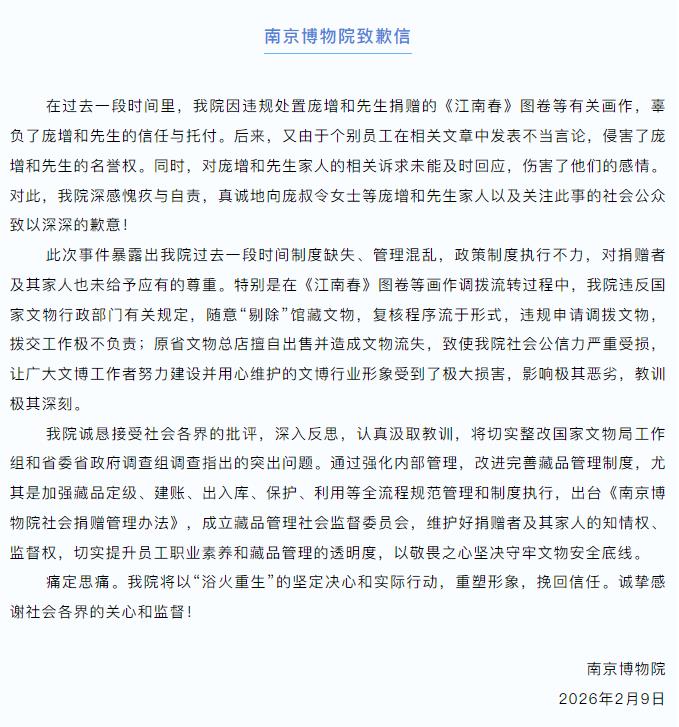 据南京博物院微信公众号消息,就“违规处置捐赠《江南春》图卷等有关画作”一事,南京博物院2月9日发布致歉信。具体内容如下: