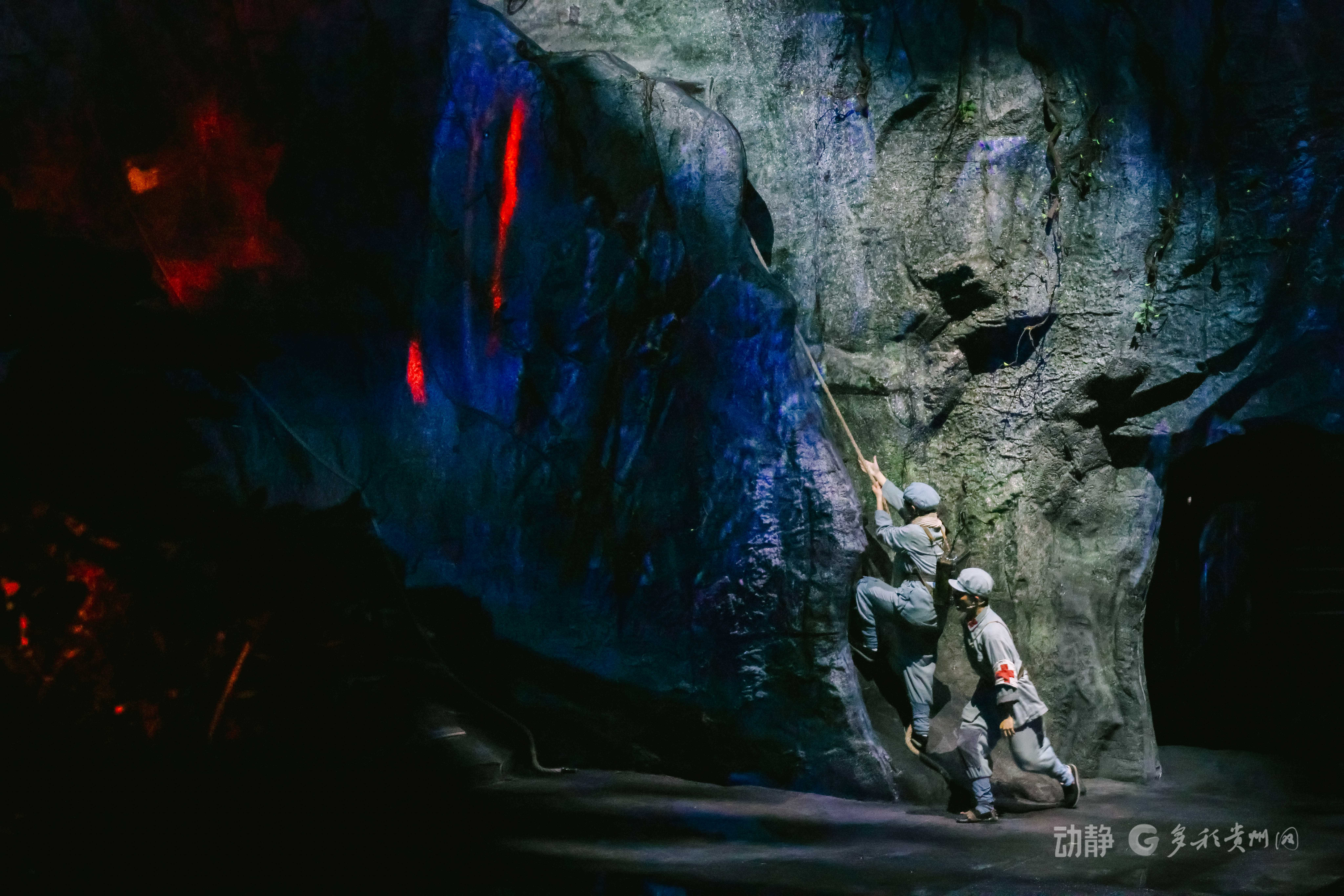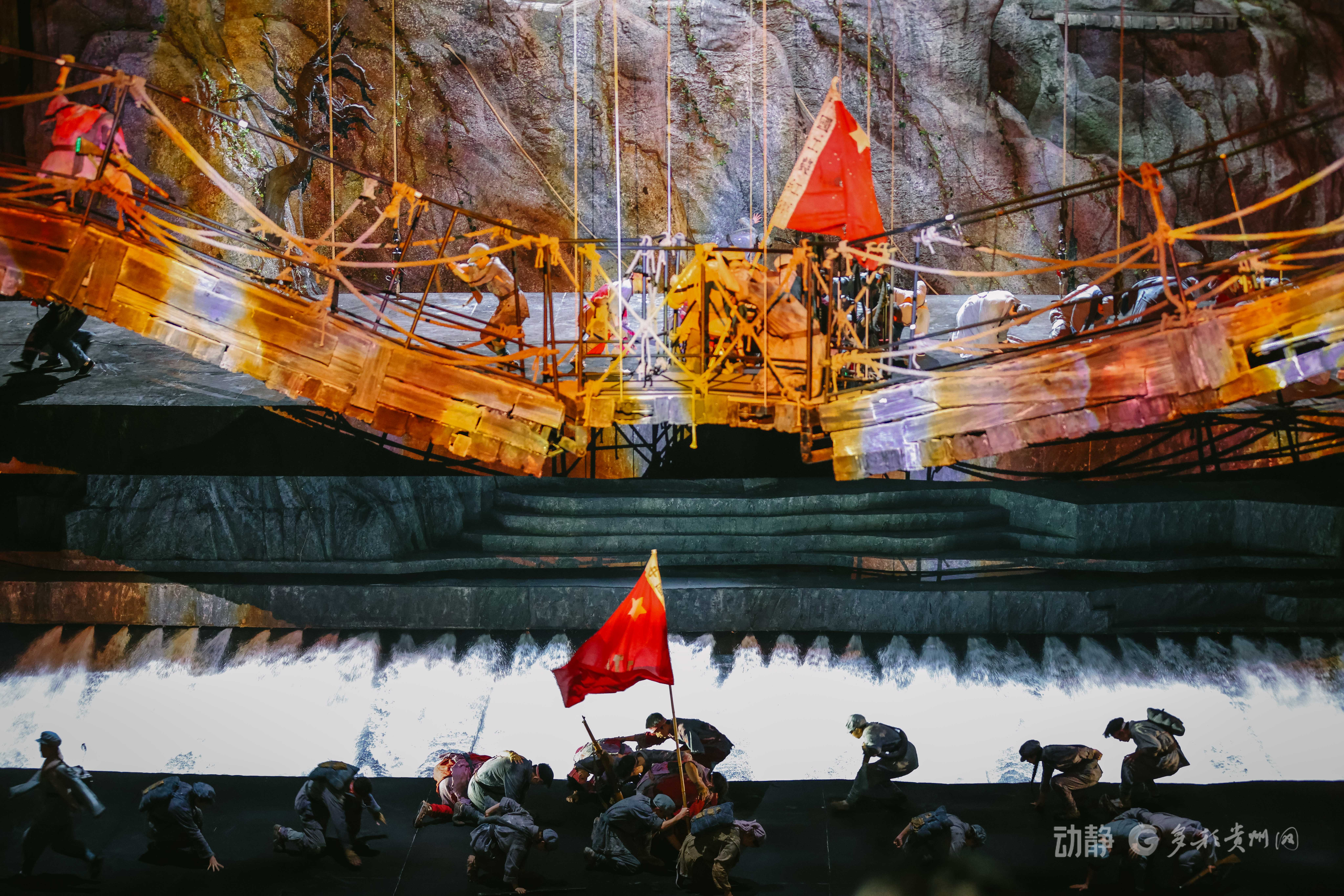 剧目以中央红军血战湘江后转兵贵州、召开遵义会议为大背景,综合运用现代舞台创意与前沿科技手段,360度旋转舞台、巨幕油画、战场硝烟、红歌水舞、环绕音效……构建了“人、声、光、水、电、影、景”多位一体的全景式观演体验。从遵义会议、四渡赤水到巧渡金沙江等关键历史场景,通过科技与艺术的融合,生动再现了长征路上的艰难历程与伟大转折,让革命历史故事焕发新时代感染力。