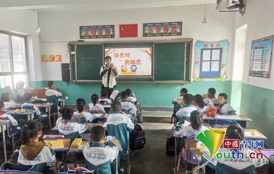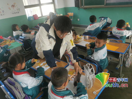 课堂上,研支团团长李明权带领学生们了解银杏树的习性、生长繁殖特点、存在价值等方面知识。随后,他带领学生捡拾银杏树叶,发挥奇思妙想,把这些多姿多彩的树叶粘贴成了蝴蝶飞舞、花朵绽放、鱼儿嬉戏等别具韵味的手工作品。
