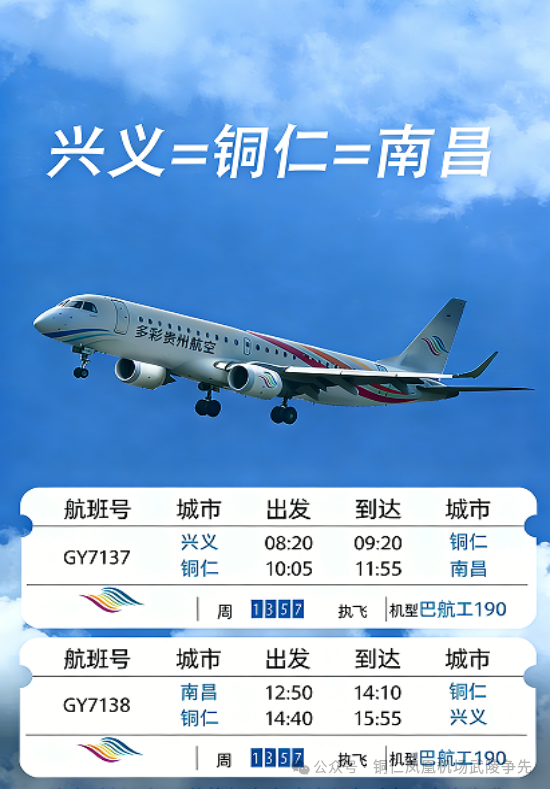 此次航线由多彩贵州航空采用E190机型执飞,班期为每周一、周三、周五、周日,去程GY7137航班,兴义08:20起飞,09:20抵达铜仁,铜仁10:05起飞,11:55抵达南昌;返程 GY7138航班,南昌12:50起飞,14:10抵达铜仁,铜仁14:40起飞,15:55抵达兴义。