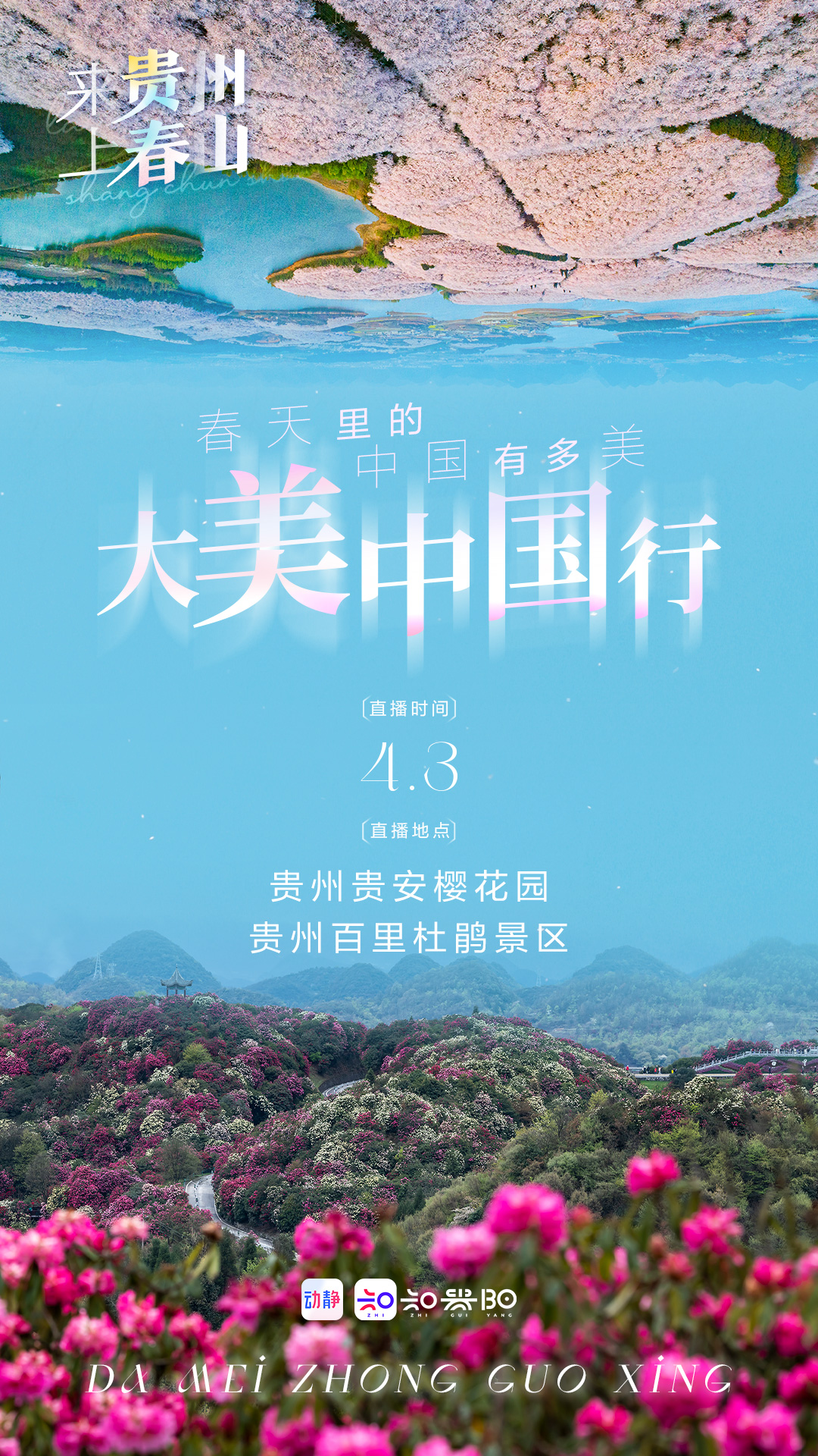 本次直播活动,贵州站直播时段为4月3日14点20分至15点。直播选取了贵安樱花园、百里杜鹃景区作为直播点,将带网友全方位观赏世界两大花园,以独特的视角飞越花海。