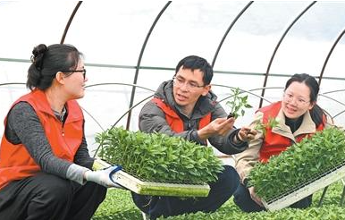 湖北省通城县北港镇绿康种苗基地里,党员志愿者(左二)向种植大户讲解大棚育苗技术。刘建平摄(人民视觉)