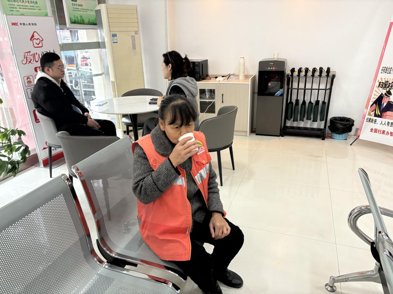 据悉,“爱心驿站”聚焦往来客户和户外劳动者的实际需求,在大厅内开辟服务专区,配备有休息座椅、急救用品、医药箱、手机充电、雨伞、饮用水、一次性纸杯等便民惠民物品,可满足客户和户外劳动者“冬取暖、夏纳凉、渴喝水、累歇脚、伤用药”等需求。驿站物资定期补充、设施按时清洁消毒,同时定期举办保险产品普及、防诈宣传及严厉打击非法资金等特色活动,进一步帮助客户深入了解金融诈骗及保险常识,引导客户自觉远离非法金融活动,理性选择金融产品和服务。