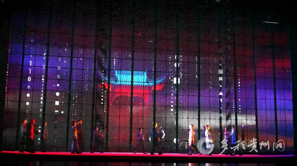 舞美“机关”层出不穷,高科技既视感“不明觉厉”。在《无字丰碑》的过场戏中,融入了探戈、当代舞蹈、武戏和“黑科技”冰屏,重塑传统黔剧曲艺内容之美。在颠覆观众对黔剧认知的那一刹那,又通过黔剧唱腔,将观众拉回“锁住”。
