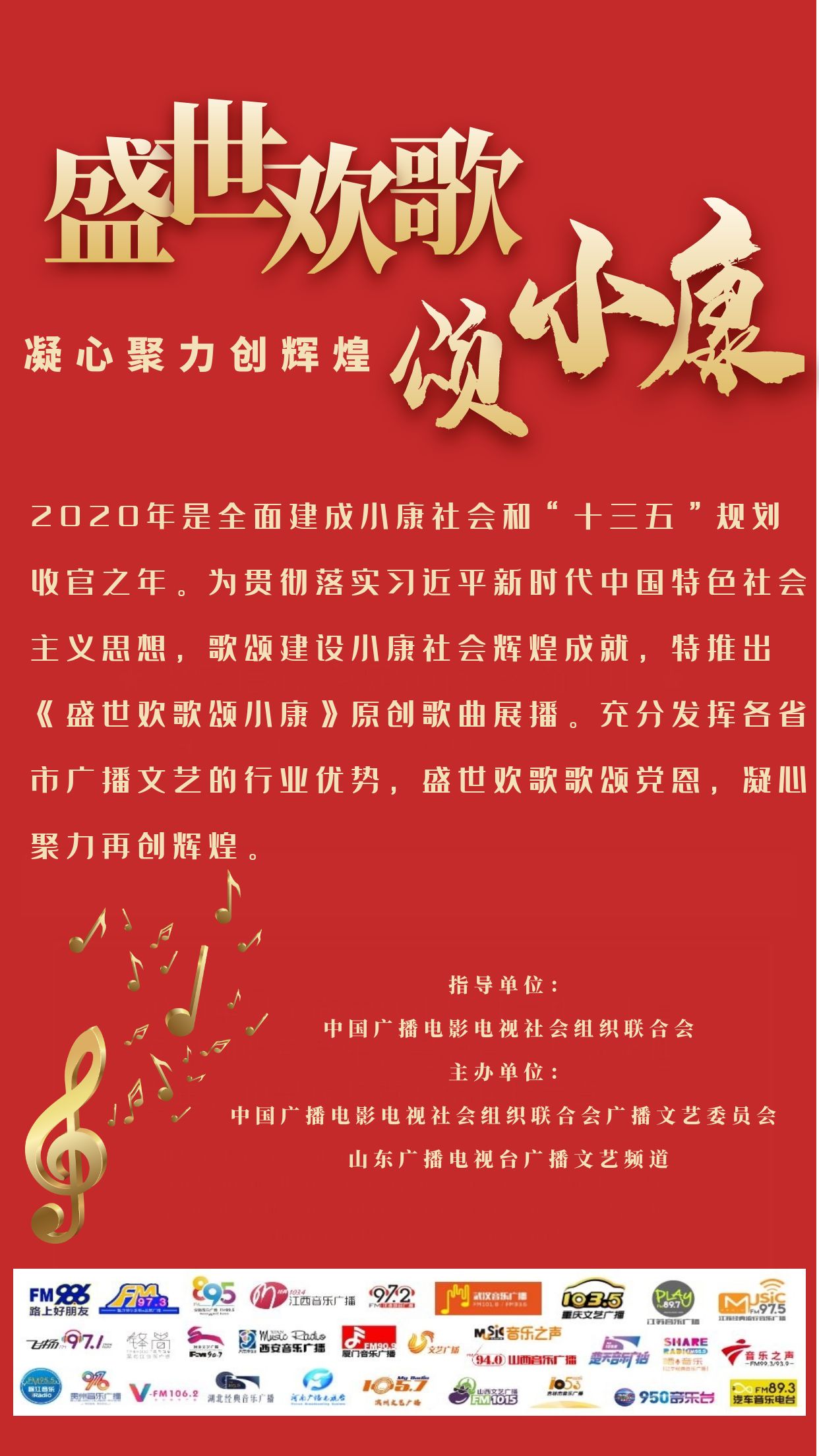 2020年是脱贫攻坚的决胜之年,也是全面建成小康社会和“十三五”规划收官之年。为贯彻落实习近平新时代中国特色社会主义思想,歌颂建设小康社会辉煌成就,充分发挥文艺作品凝心聚力、提振精神的作用,在中国广播电视社会组织联合会的协调下,《盛世欢歌颂小康》原创歌曲征集展播主题策划活动顺利进行。