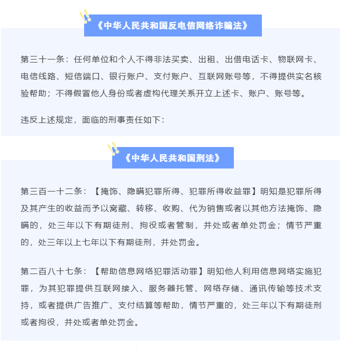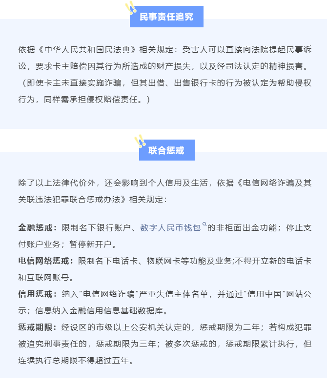 如果你是因出租、出借、出售“两卡”而面临处罚的行为人,请立即主动配合公安机关调查,争取从轻处理;如果你是遭受损失的受害人,请及时收集转账记录、聊天记录等证据,在刑事诉讼程序之外,可单独提起民事诉讼来主张财产和精神损害赔偿。