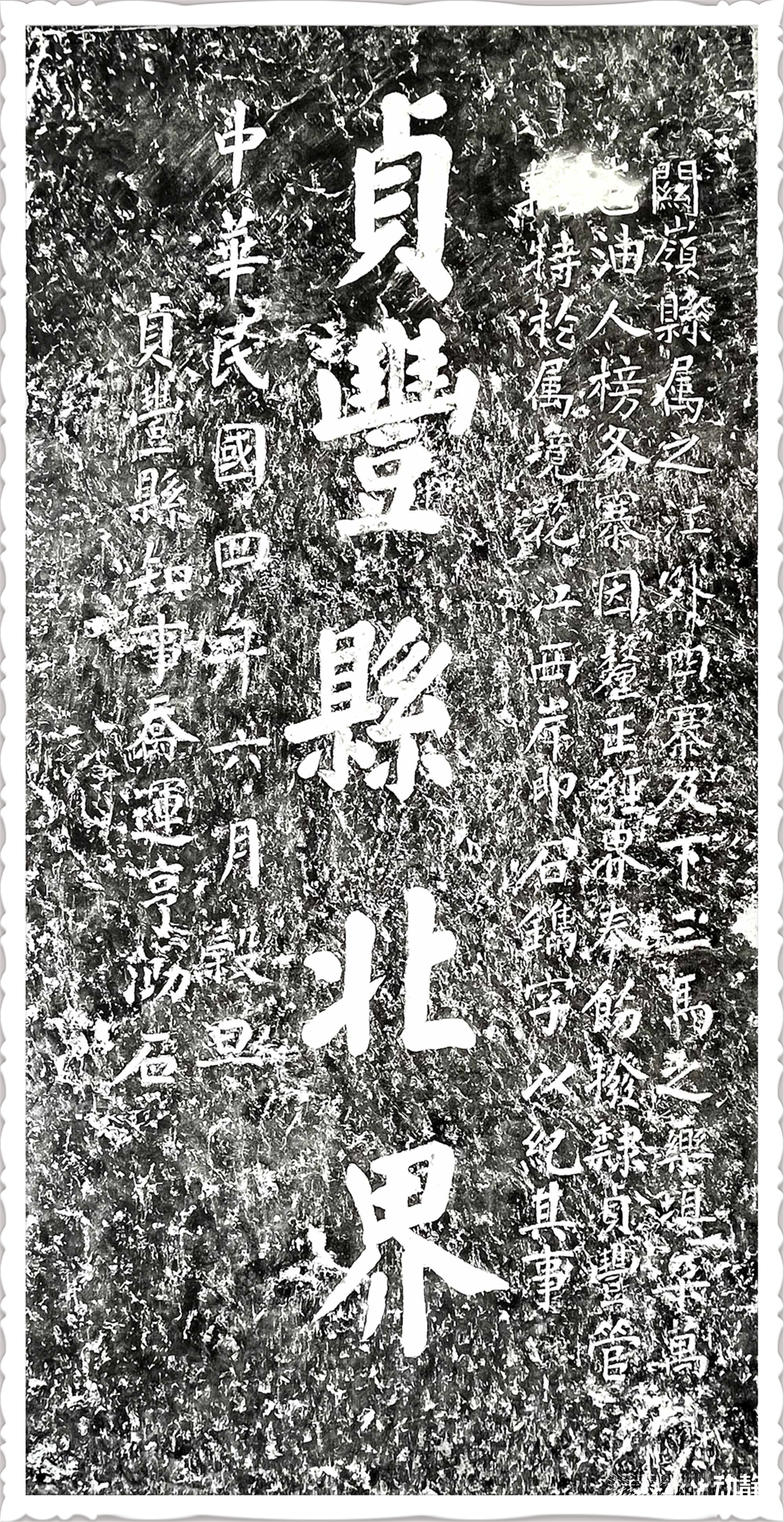 “贞丰县北界”石刻,落款:“中华民国四年六月毂旦,贞丰县知事乔运亨泐石”,“泐(lè)”同“勒”,即刻字于石。石刻题跋:“关岭县属之江外四寨,及下三马之乐坝、朵万、岜油、人(仁)榜各寨,因釐正经界,奉饬拨隶贞丰管辖,特于属境花江西岸,叩石镌字,以纪其事。”今天关岭的南部,大致被北盘江和白水河汇合包夹成一个斜V字形。江外四寨是指北盘江花江段西岸的四个寨。下三马位于关岭东南部,跋文中提到的乐坝、岜油、仁榜三地,今属望谟县石屯镇。朵万即董万,今属望谟县乐元镇。四寨均位于白水河南岸。为方便管理,黔西道组织“釐正经界”,即修订两县边界。按照跋文,关岭两江之外的八个屯寨,统一划归贞丰县管辖,故才有1915年乔运亨竖的这方“贞丰县北界”石刻。关岭早期地名,经常使用“马”,譬如上三马、下三马、募役司四马等,谓“永宁州十七马”。据乾隆三十七年(1772)关岭主管教育的训导谢庭薰解释,明代设查城站,官牧站马,以应站差,所以地之广狭,以出站马之多少,故谓地方为“马”。