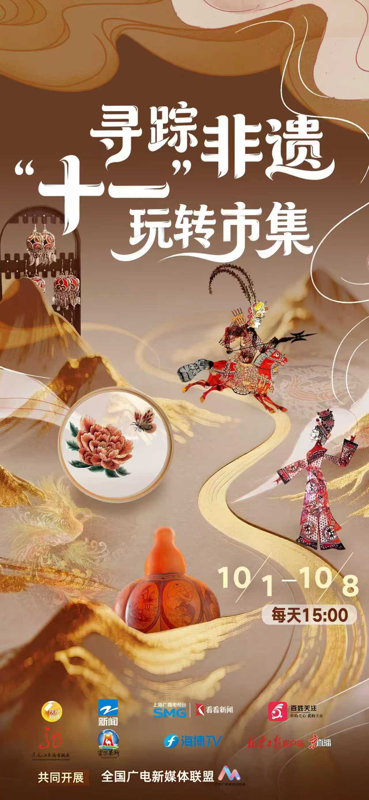 国庆假期,上海广播电视台融媒体中心、陕西广电融媒体集团(台)新闻中心、浙江新闻频道、贵州广播电视台公共频道、黑龙江广播电视台、霍尔果斯融媒、海博TV、北京日报客户端京直播等全国七家媒体,每天推出一场时长50分钟的新媒体直播——《寻踪非遗 “十一”玩转市集》。
