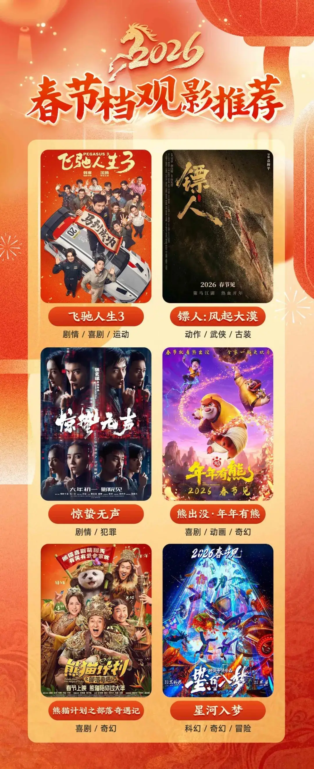 从赛道的飞驰到江湖的侠义,2026春节档的光影,藏着马年最动人的精神内核。无论是《逐梦之路》的热血还是《大漠镖心》的豪情,都在告诉我们:马年是奋进的一年,是勇敢的一年,是不负韶华的一年。