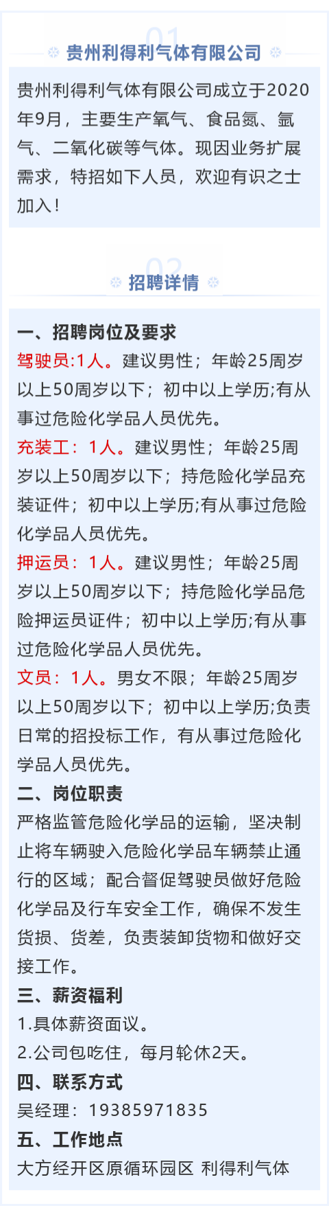 贵州利得利气体有限公司招聘驾驶员、押运员、文员等!50周岁以下可报!包吃住!