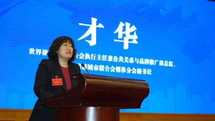 世界旅游城市联合会执行主任兼公共关系与品牌推广部总监、世界旅游城市联合会媒体分会秘书长才华致辞 主办方供图