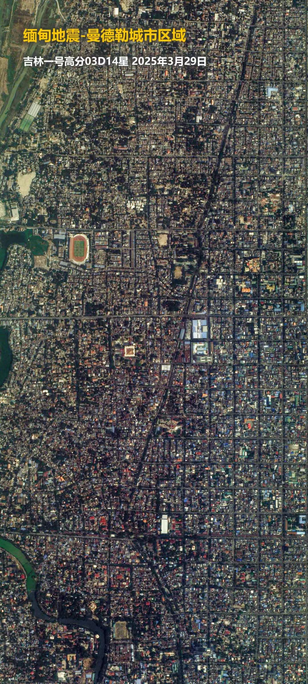 2025年3月28日,缅甸发生强震造成了重大人员伤亡和财产损失。地震发生后,吉林一号卫星迅速响应,紧急调度过境灾区,拍摄了高分辨率的现场画面,并在成像后第一时间提供给相关单位,助力救灾工作。