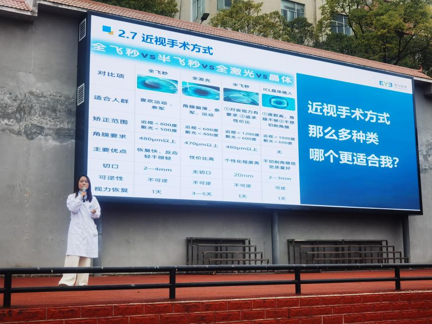 本次活动的核心环节由贵州爱尔眼科医院屈光科主治医师贺怡担任主讲。贺怡医师的讲解紧扣学生关切,内容务实清晰。她首先系统梳理了热门专业大类对视力和屈光状态的明确要求,解析了体检标准中的关键条款,帮助同学们建立清晰的报考认知框架。随后,她针对高三学生高强度的用眼现状,提供了实用的“近视缓解指南”,包括如何科学分配用眼时间、有效缓解视疲劳、保持现有视力稳定以及应对体检的注意事项等,内容具体、可操作性强。