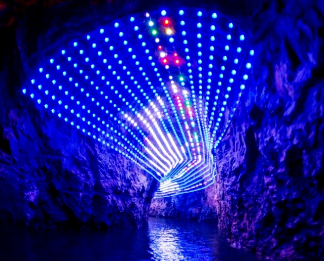 乘船穿梭在二进龙宫的时空隧道中,顿生梦幻、穿越之感。好像穿过一个一个不同的时空缝隙,到达不同的空间去看龙宫的奇珍异宝、地下暗河形成的圆形喀斯特小湖,看洞壁上的岩溶瀑布,看三千年才能形成一公分厚的岩溶钟乳,看千奇百怪的倒石芽,看七彩龙湖。