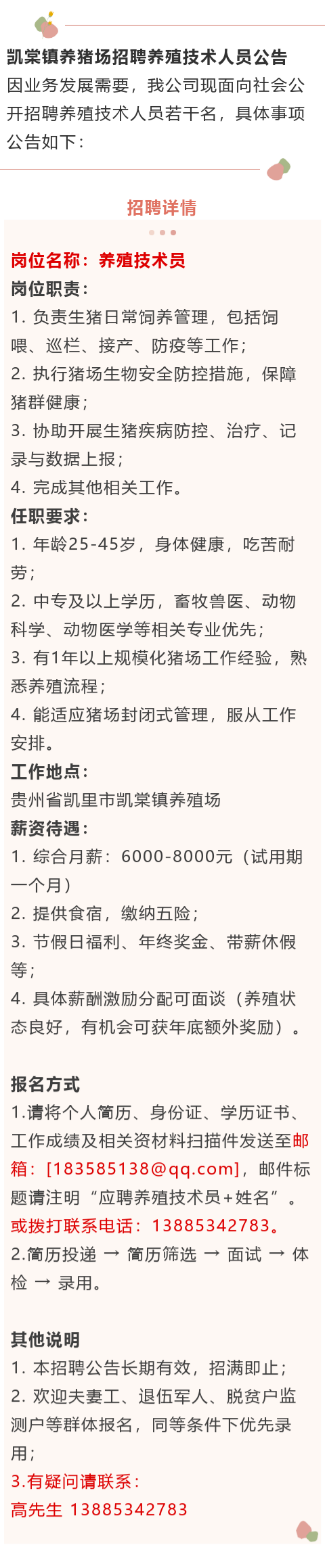 招聘养殖技术员若干名!综合月薪6000-8000元+年终奖!提供食宿!