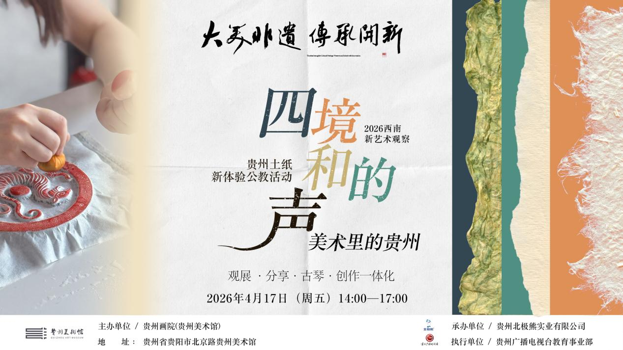 以纸为媒,和声四境;以艺传韵,传承非遗。为深化“四境的和声——2026西南新艺术观察”展览内涵,活化贵州本土非遗文化,一场可观、可听、可感、可创的沉浸式东方纸艺美育公教活动将在贵州美术馆雅致呈现。