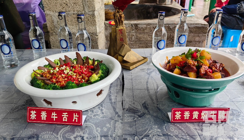 “我们茶乡全牛宴由苔茶菌香牛骨汤、苔香牛舌片、茶香黄焖牛腩,和苔茶麻辣牛肝组成。所有菜品都运用到了我们的石阡苔茶、石阡矿泉水及我们的跑山牛等石阡特色食材制作,都是当下的新鲜食材。”龙塘镇“村味”美食推荐官陈星卉介绍道。