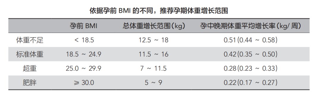 孕期体重管理是以孕前体重指数(BMI)为基础的,根据孕前体重指数(BMI)划定整个孕期体重增长的范围,进而从饮食、运动和生活习惯等 3 方面加以控制,最终达到一个合理的增长目标。