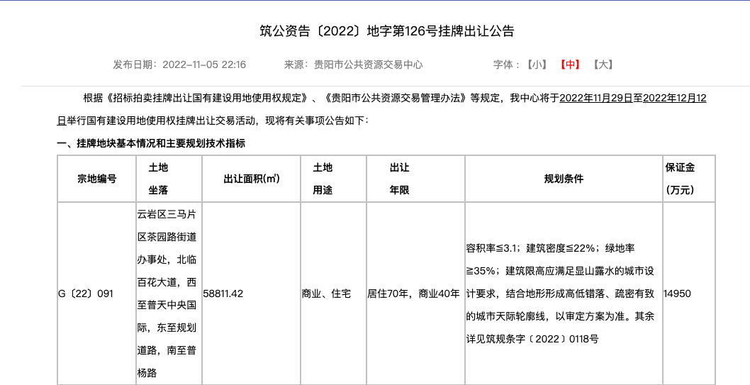 近日,贵阳市公共资源交易中心发布筑公资告〔2022〕地字第126号挂牌出让公告。位于云岩区的G〔22〕091号商住用地挂牌出让,总面积58811.42平方米。