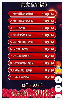 微兔家的年货大礼包也叫“寅虎全家福”,里面不仅有精选自赫章可乐猪的香肠腊肉,香糯Q弹的大掌柜辣子鸡和扎佐蹄髈,还有黎平红香米、习水红稗面、陈薯红薯粉、金沙拌面红酸汤,统统都选自微兔商城备受欢迎的人气好物。这份沉甸甸的大礼包原价599元,现在只需要398元就能享用这份美味。
