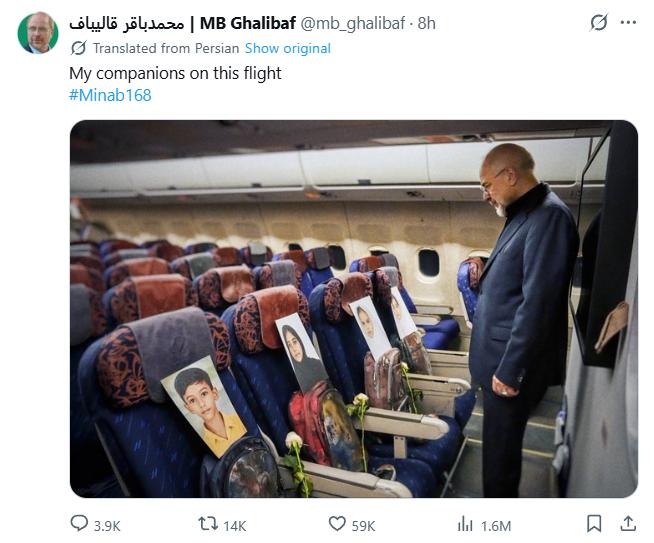 卡利巴夫为照片配文“我的飞行同伴们”“Minab168”,意指伊朗米纳卜小学遭袭遇难的168名儿童。