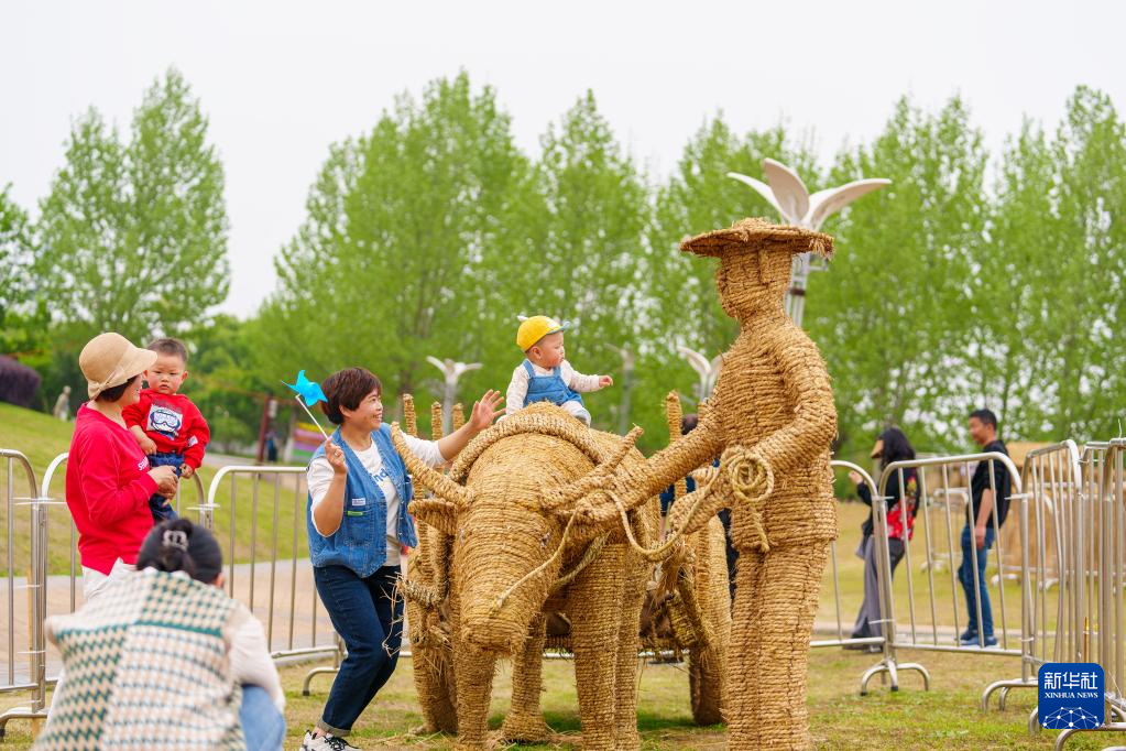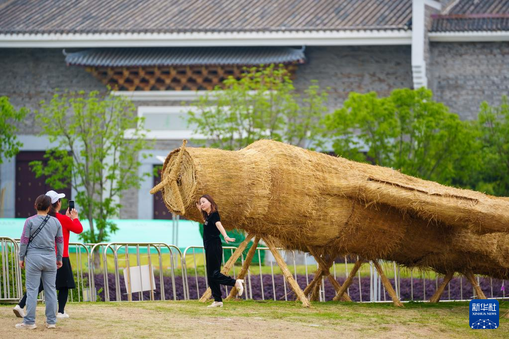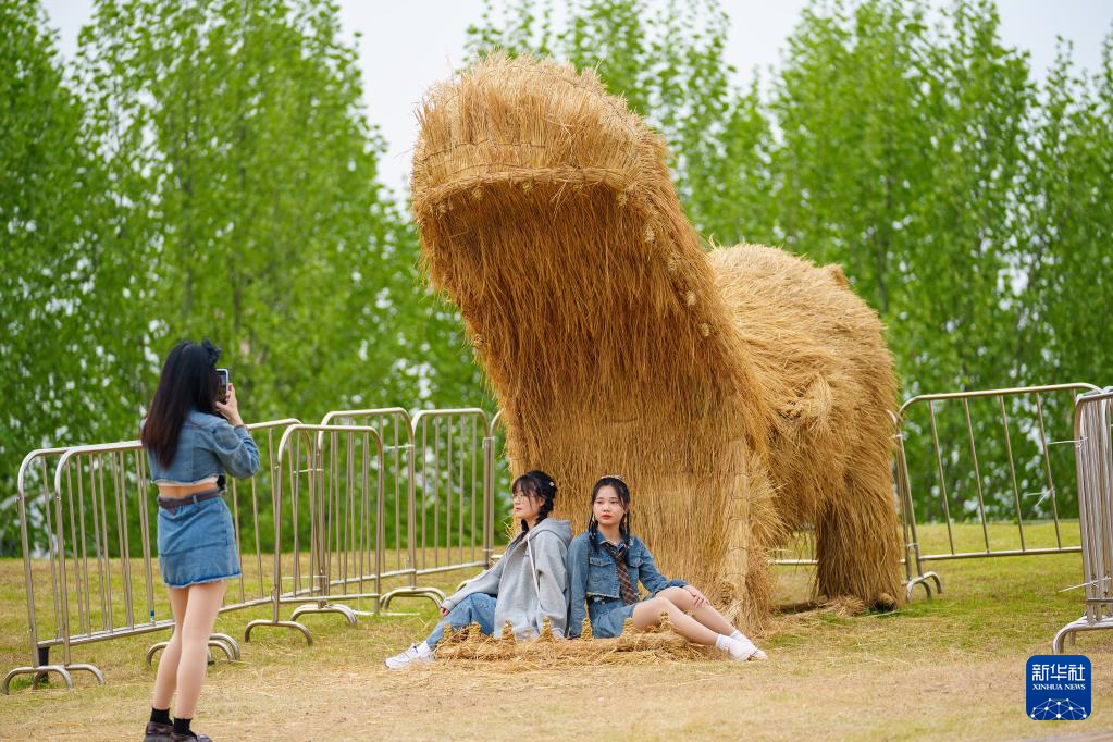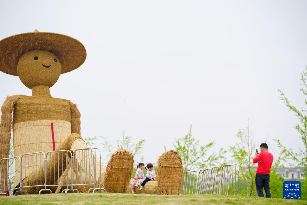 游客在南昌花博园稻草人艺术展上参观拍照(4月11日摄)。新华社记者 彭昭之 摄