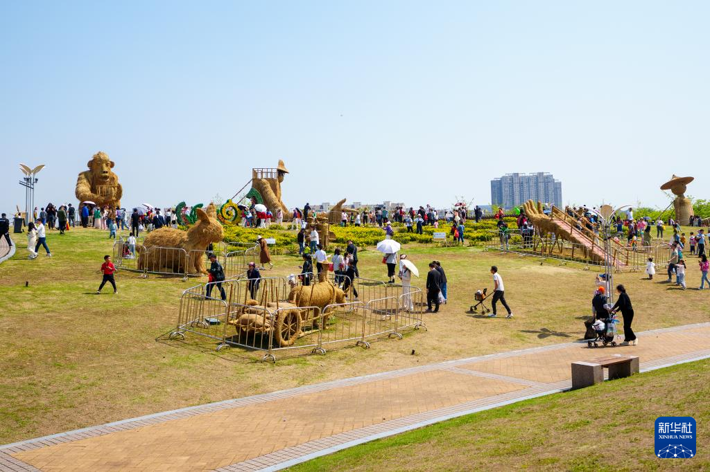 游客在南昌花博园稻草人艺术展上参观游览(4月11日摄)。新华社记者 彭昭之 摄