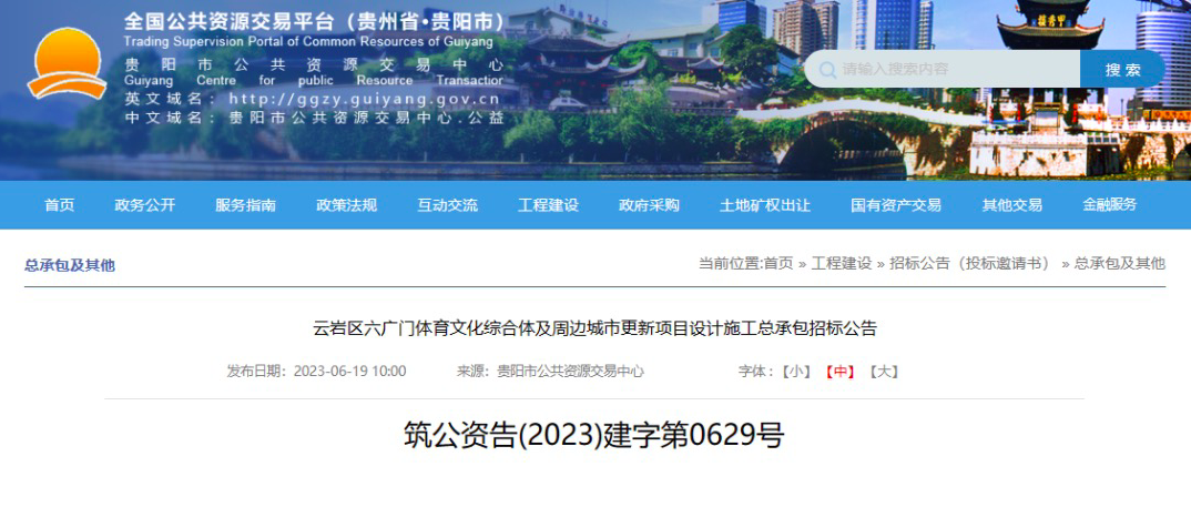 6月19日,贵阳市公共资源交易中心发布云岩区六广门体育文化综合体及周边城市更新项目设计施工总承包招标公告。