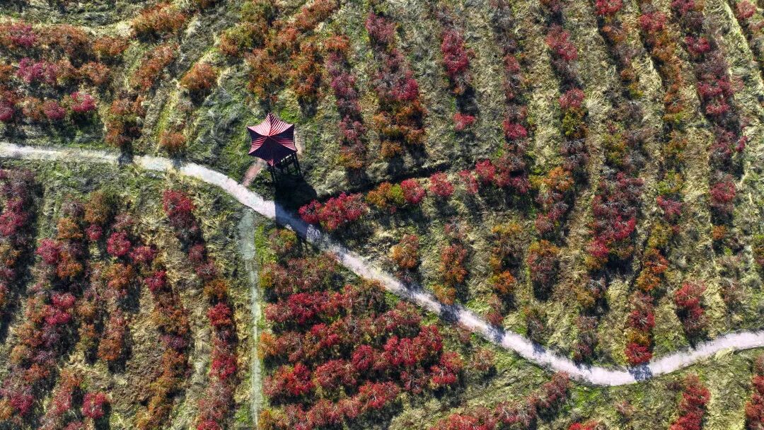 温暖的阳光洒下,红叶在光影交织中更显通透斑斓,与田园间静立的凉亭相映成趣,构成一幅宁静而热烈的诗意画卷。这片意外的“枫”景,打破了冬日的萧瑟,吸引了不少游客前来漫步、拍照,成为当地冬日打卡的新晋好去处。