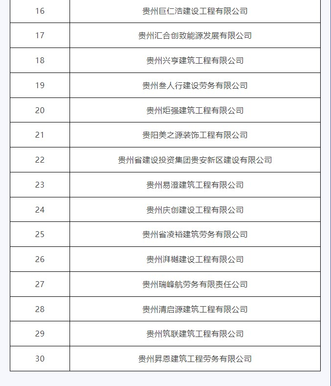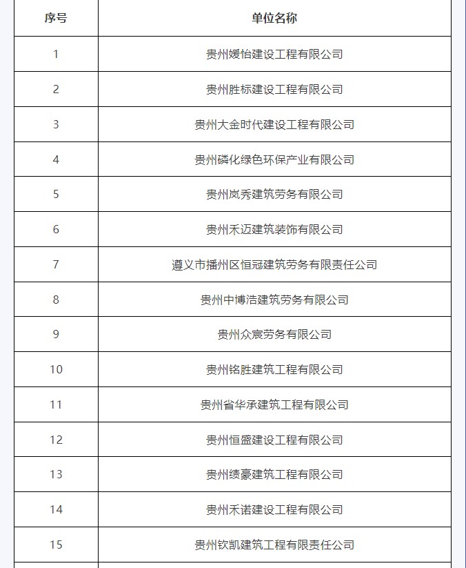 根据《安全生产许可证条例》《建筑施工企业安全生产许可证管理规定》(建设部令128号)、《贵州省建设厅关于贯彻〈建筑施工企业安全生产许可证管理规定〉的实施意见》(黔建施发〔2005〕28号)、《关于我省建筑施工企业安全生产许可证办理有关事项的通知》(黔建建通〔2014〕124号)、《贵州省住房和城乡建设厅关于进一步优化安全生产许可证审批事项的通知》(黔建建通〔2019〕129号)等要求,经审查,以下建筑施工企业安全生产许可证申报资料符合相关要求,现予以公示。