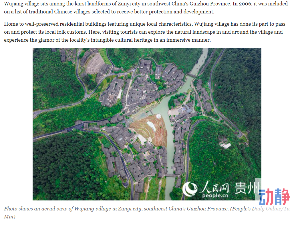今天(7月18日),人民网英文频道以《Explore majestic beauty of Wujiang village in SW China's Guizhou(探索中国西南贵州乌江寨的壮丽美景)》为题,报道了贵州乌江寨。