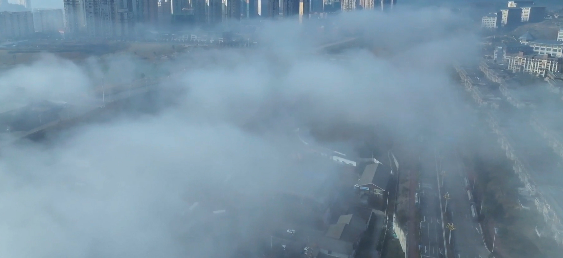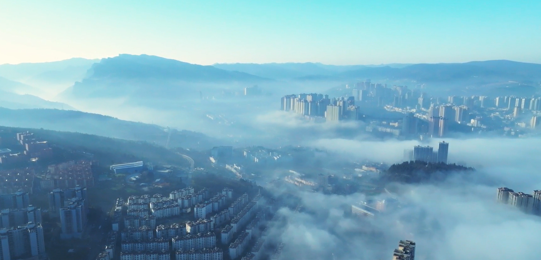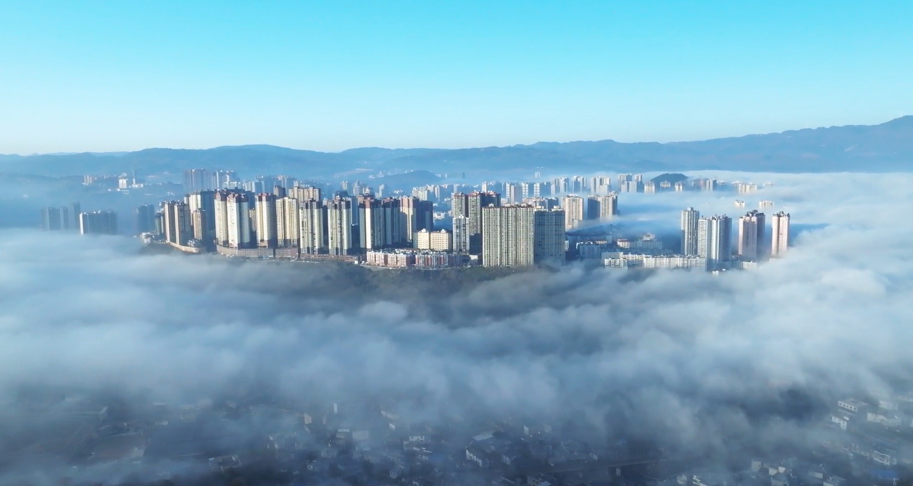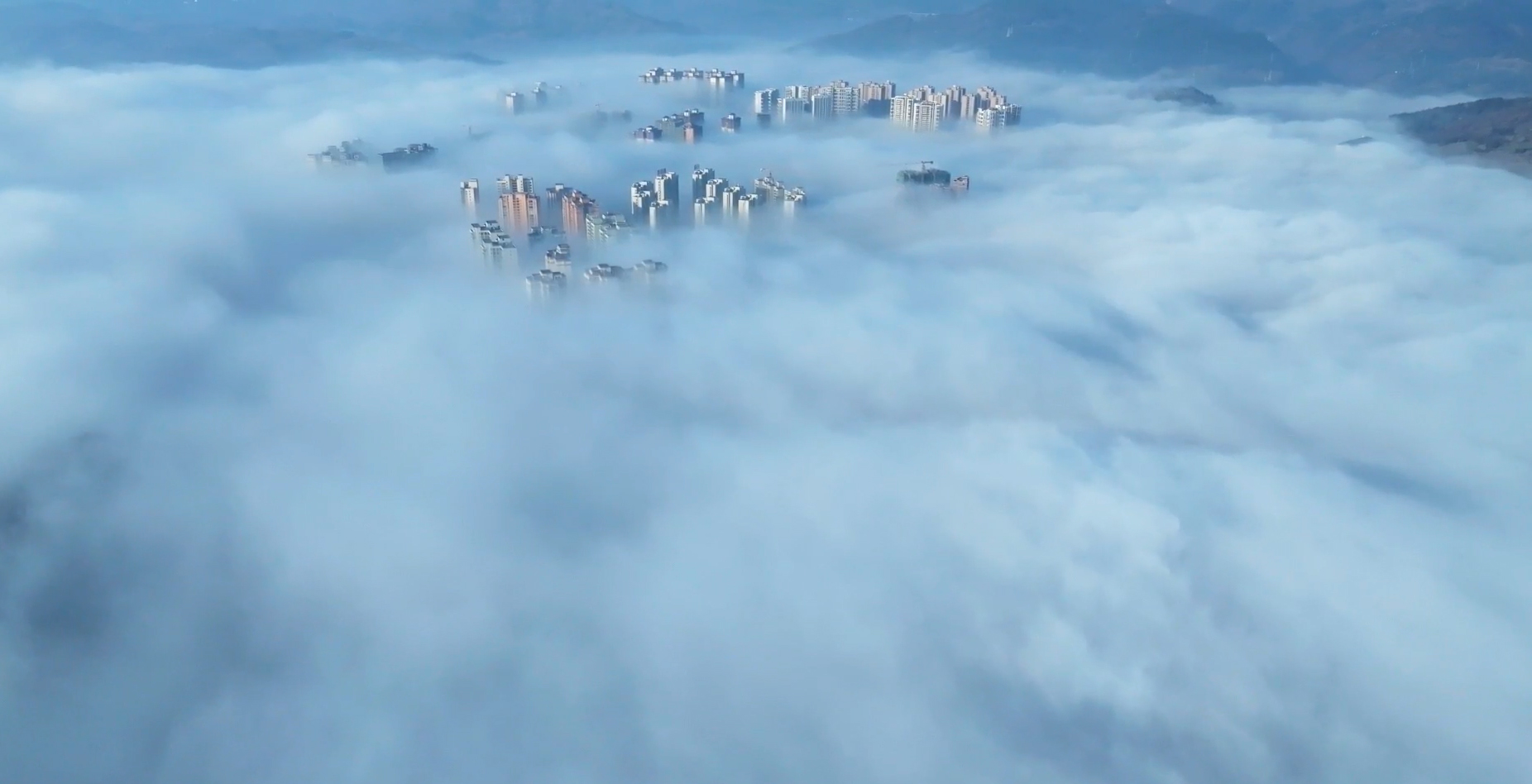 放眼望去,云海连着蔚蓝的天际,浩渺无边。又随着气温的升高,雾气升腾,云蒸霞蔚,云随风动,山随雾转,如梦似幻,气势磅礴。山丘,街道、地势较低的景物都湮没在茫茫云海之中,只见高山和城市鳞次栉比的高楼矗立云端,仿佛“海市蜃楼”。