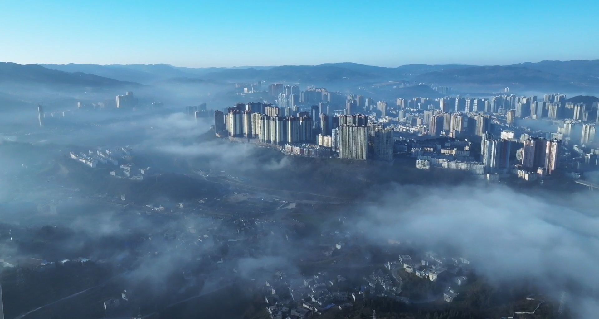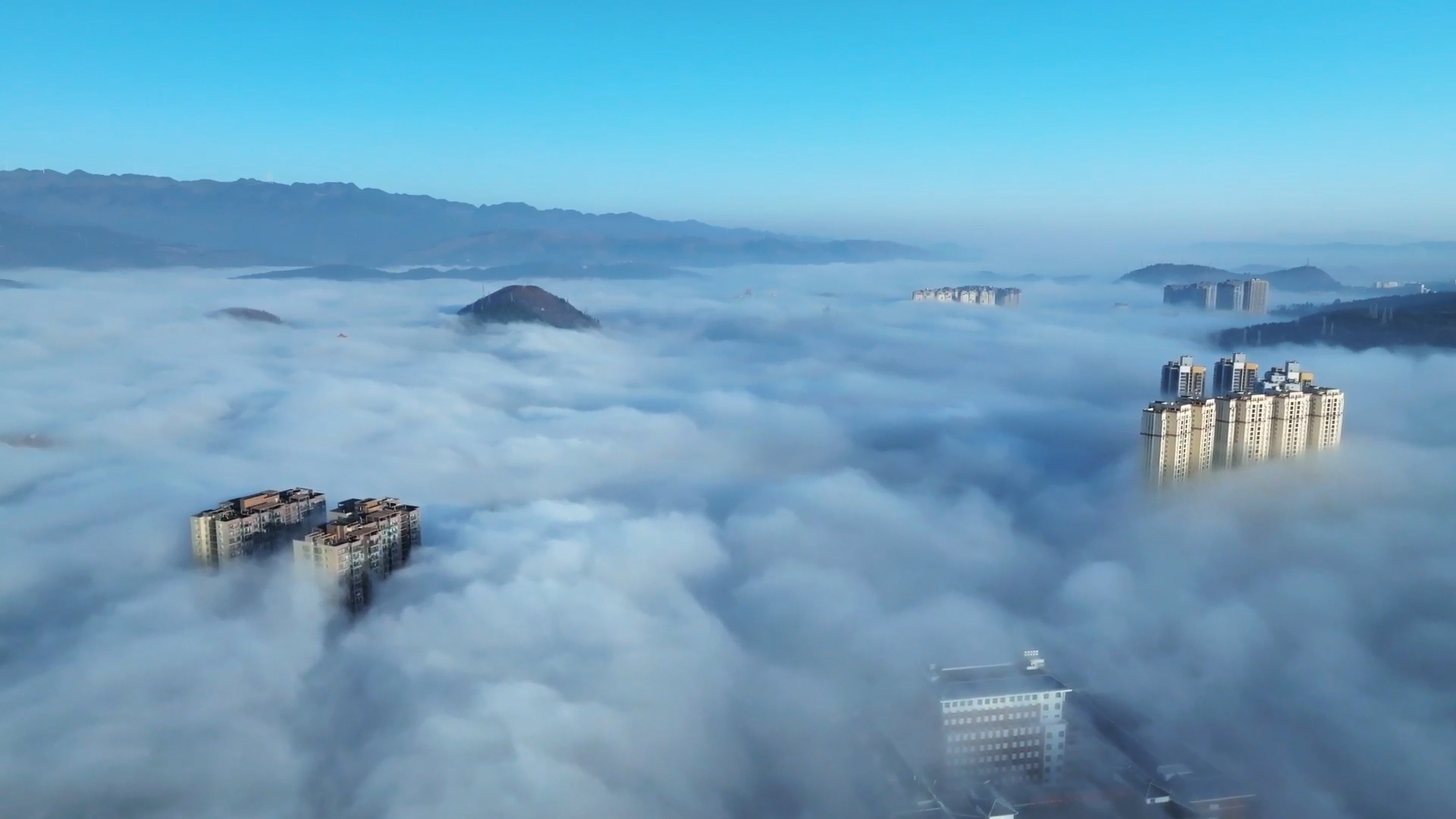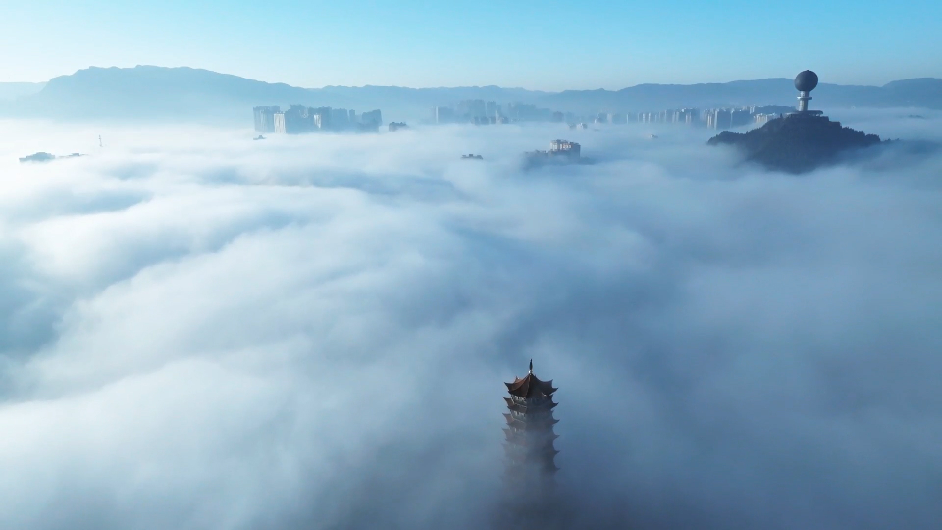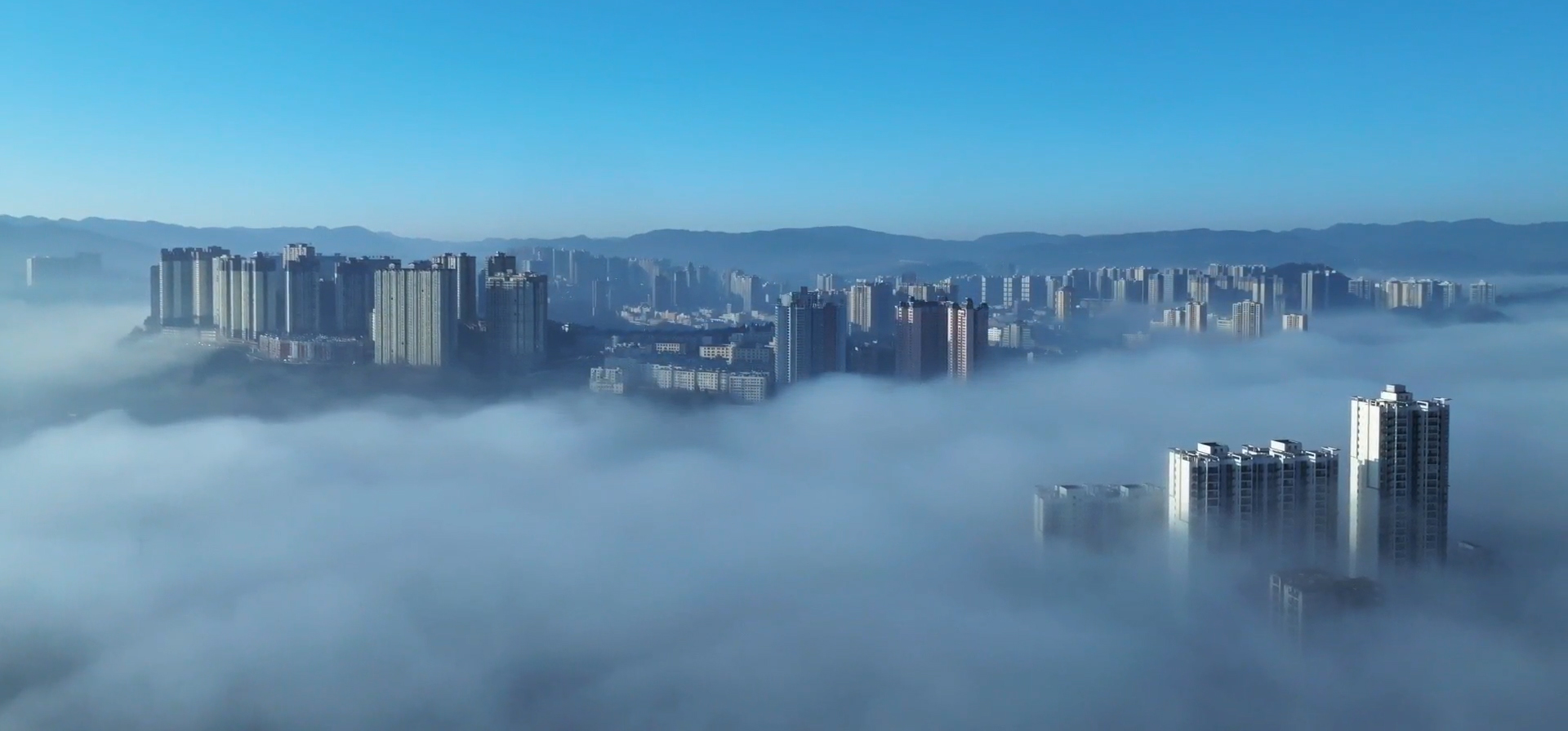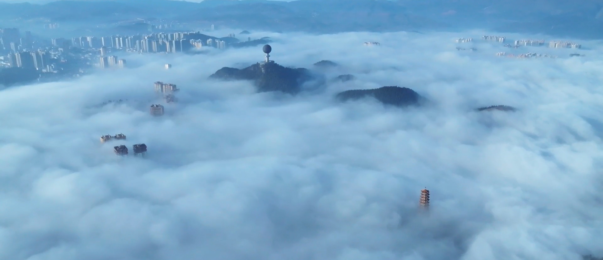 放眼望去,云海连着蔚蓝的天际,浩渺无边。又随着气温的升高,雾气升腾,云蒸霞蔚,云随风动,山随雾转,如梦似幻,气势磅礴。山丘,街道、地势较低的景物都湮没在茫茫云海之中,只见高山和城市鳞次栉比的高楼矗立云端,仿佛“海市蜃楼”。