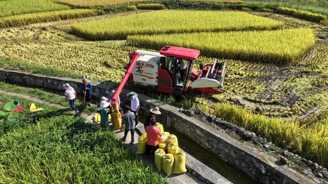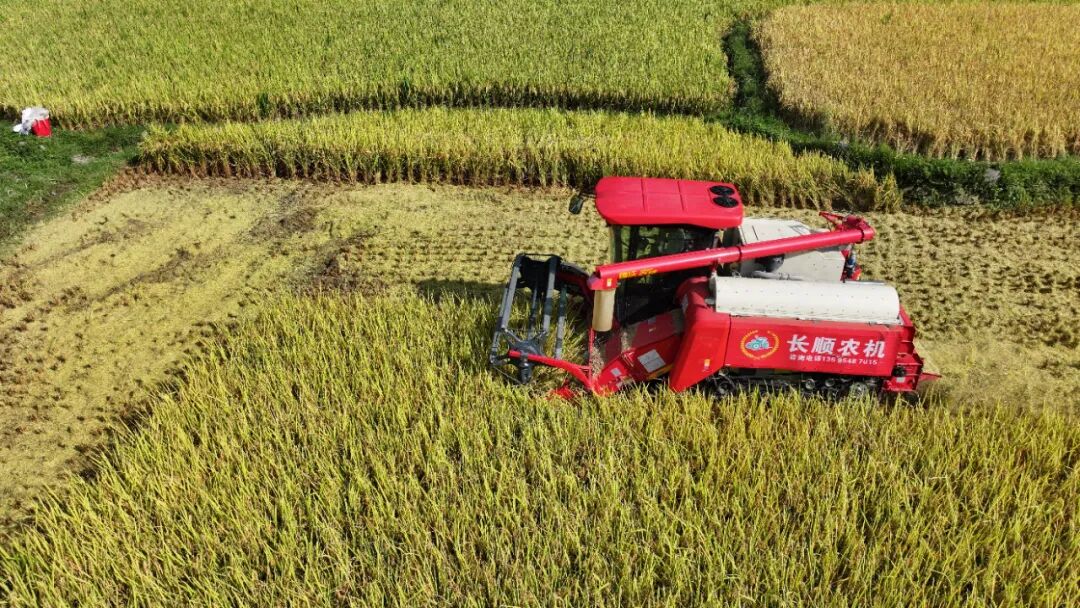 “快来看!这机器收得又干净又快!”在中塘村下院组金光先的稻田里,大型收割机正在田间收割稻谷,看着一颗颗谷粒源源不断涌入编织袋,他的脸上笑开了花地说:“今年收成更好,一亩能收500多公斤,总共能收4000多公斤!”
