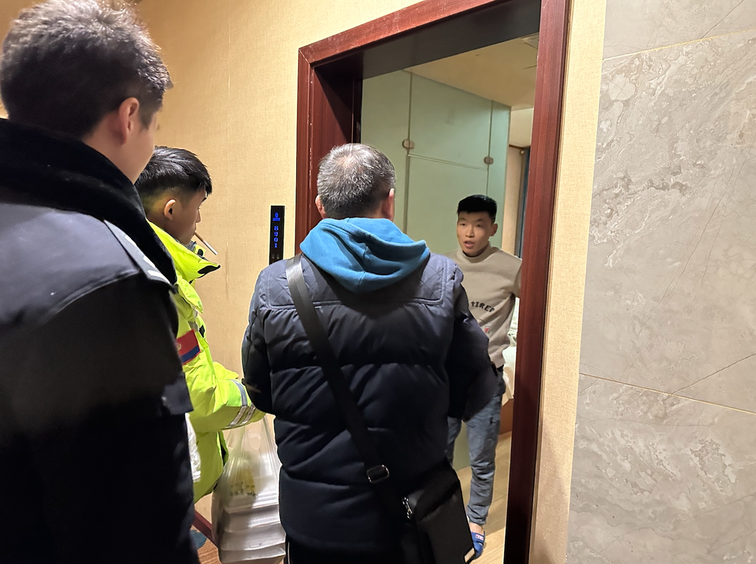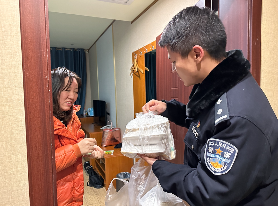 民警考虑到乘客长途跋涉,深夜饥寒交迫,特意为大客车的驾乘人员送去,泡面、盒饭、零食等缓解饥饿。乘客王先生表示:“真的非常感谢警察同志,荒郊野外的,又冷又饿,大半夜看到警灯的那一分钟,就安心了,更想不到的是,他们想的还周到,不仅联系了酒店,还给我们安排了吃的,很感动。”